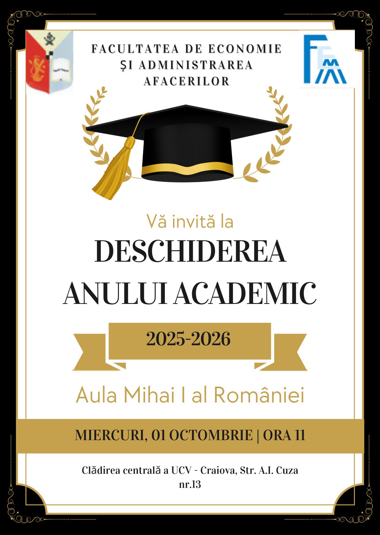 Vă așteptăm cu drag să participați la evenimentul de deschidere a noului an universitar, miercur, la ora 11:00, în Aula Mihai I al României (Sala Albastră) a Universității din Craiova